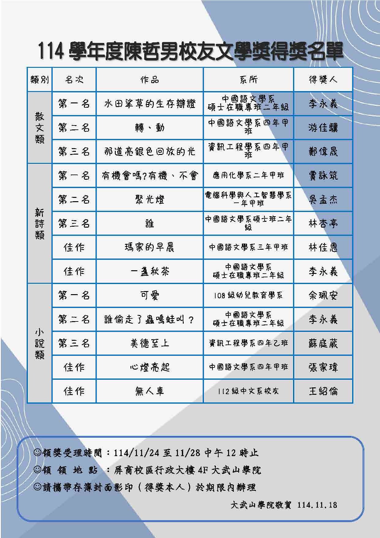 為表彰陳哲男校友之捐助,以鼓勵本校學生文學創作,特訂定陳哲男校友文學獎,徵文分散文、小說、新詩三類,